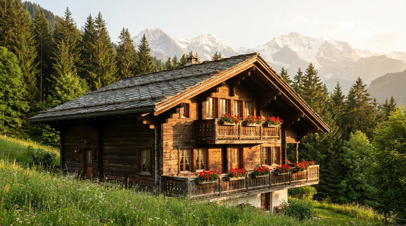 „Photorealistischer Aussenrender eines traditionellen Schweizer Chalets am alpinen Hang, dunkle Holzfassade, steiles Satteldach, geschnitzte Balkone mit Geranien, dahinter Pinienwald und schneebedeckte Berge, warmes Abendlicht, cineastische Komposition.“