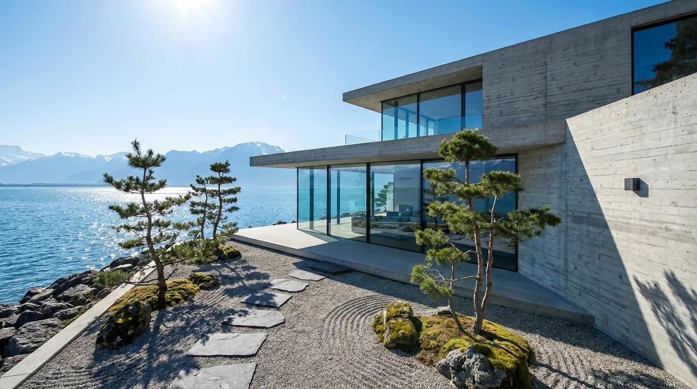 „Minimalistische Schweizer Villa aus Beton und Glas am Genfersee, begrüntes Dach mit Solarpaneelen, Zen-Garten, helles Mittagslicht, leichte Vogelperspektive, klare Spiegelungen in der Glasfassade, photorealistische Architekturvisualisierung.“