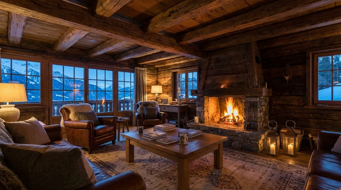 „Gemütlicher Schweizer Chalet-Wohnraum mit sichtbaren Holzbalken, gealterten Holzverkleidungen, grossem Naturstein-Kamin, warmem orangefarbenem Licht, rustikalen Möbeln, Wolldecken, weichen Ecklampen, nächtlicher Atmosphäre und realistischen Schatten.“
